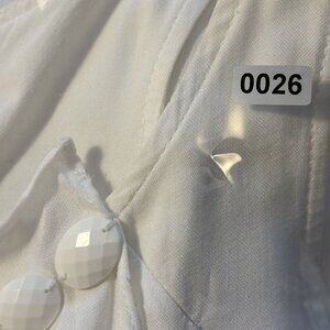 This elegant white dress by Charles Chang-Lima features an asymmetrical hemline, button-back design, and a stunning jewel detail on the front. The lightweight fabric and sleeveless cut make it an excellent choice for warm-weather occasions, combining sophistication and comfort effortlessly. Its intricate detailing adds a touch of timeless charm.
