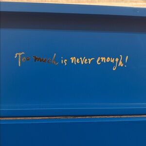 Too much is never enough in gold writing on inside of the lid