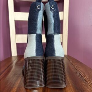 Size 8 excellent condition!! Patchwork denim boots. Features a stylish block heel. .