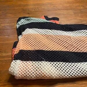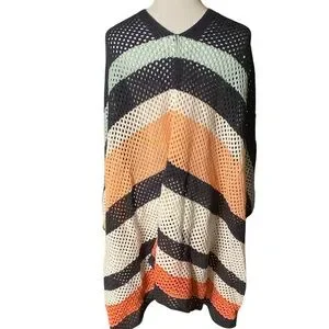 Lightweight and effortlessly stylish, this Anthropologie open-knit wrap features a bold chevron stripe pattern in charcoal, cream, peach, mint, and coral tones. The draped cocoon silhouette layers beautifully over tanks, tees, and dresses for an easy boho look year-round. Soft, breathable knit with gorgeous movement and texture.
