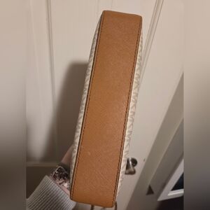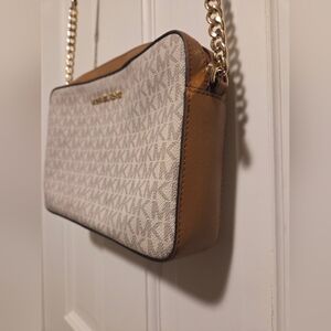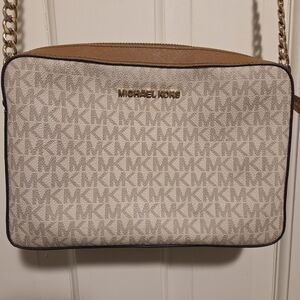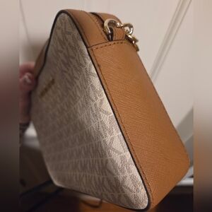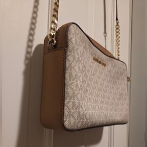 Michael Kors Off White, Grey, and Brown MK Print crossbody jet set bag