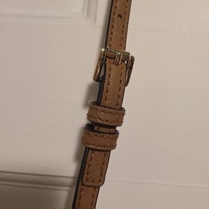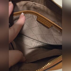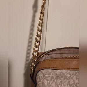 Stylish Michael Kors crossbody bag in cognac brown, grey, and cream/off white colors. Features a gold chain and brown strap and signature MK pattern in grey. Light/Cognac brown colored accents.