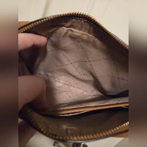 This has been worn and there is some discoloration and fading in MK print on front and back of bag. See photo details of imperfections. Inside features 2 pockets. Inside base is worn, see photo 8. Outside base and sides in decent condition. Price reflects overall condition.