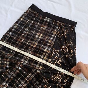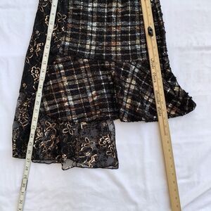 Asymmetrical mixed material lace and tweed skirt. Stock photo may be slightly different than the actual piece that was sent to stores. Reviews say may fit small.
