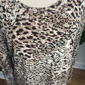 Elevate your wardrobe with this chic leopard print blouse. Its stylish design and neutral tones make it a versatile choice for any occasion. This top features specks of gold. Very pretty!