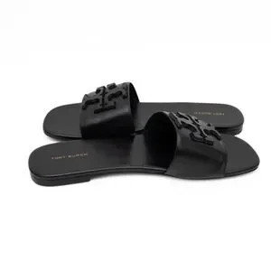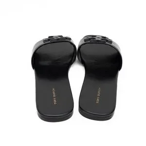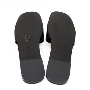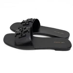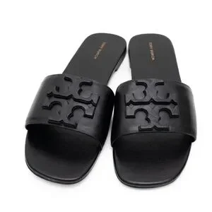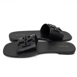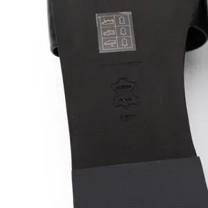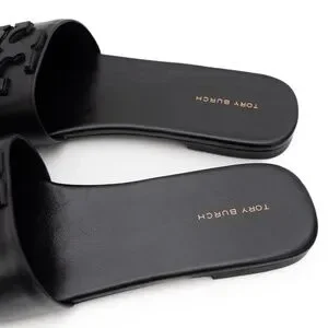 Minimal black leather slide featuring a smooth goat-leather upper with tonal raised double-T logo, square toe, and flat profile. The footbed is lightly contoured and lined in leather for comfort, while the clean silhouette makes them easy to pair with dresses, denim, or tailored looks.