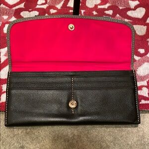 Elegant leather wallet. Features gray and black tones. Includes matching keychain.