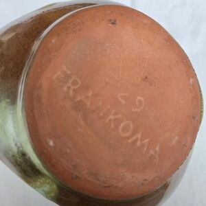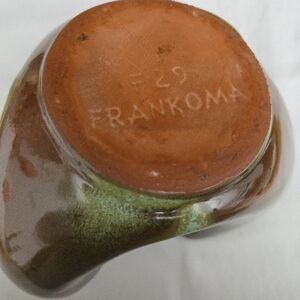 Exquisite Frankoma pottery planter or bowl marked F29, indicating the design/style. This particular pattern was introduced in 1942, with production ceasing in 1949. This highly collectible piece, 'Praire Green', features a drapery effect, scalloped at the top, in light grass green and lush brown in high glaze. Despite its age (circa '42 -'49), it is in pristine condition, without blemishes or imperfections of any sort. Frankoma is noted for its distinctive terra cotta look and colorful glazes. Measurements included in the photos. A valuable addition to any collection of fine pottery, especially Frankoma. NOTE: Frankoma pottery in glazes of blues and greens are the most sought-after.