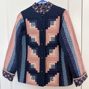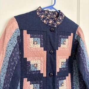 vintage quilt jacket featuring a log cabin patchwork pattern in navy blue, light blue, and pink fabrics