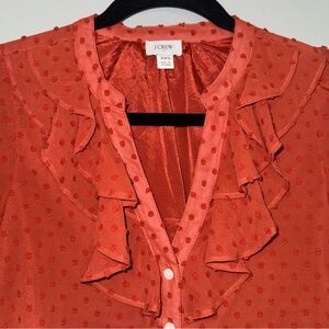J.Crew Women's Swiss Dot Ruffled Neck Button Up Blouse in Burnt Orange Size XXS