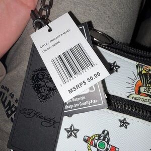 Edgy Ed Hardy shoulder bag with vibrant tattoo designs. Features a bold white base. Ideal for a standout look.