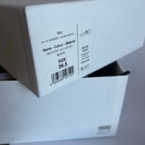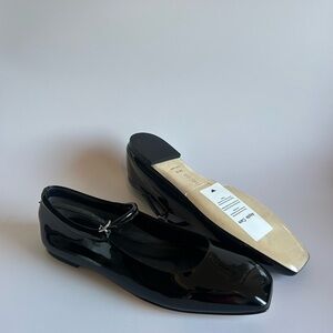 Elegant black patent leather flats. Sleek design with a modern touch. Ideal for versatile styling.