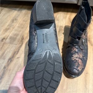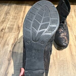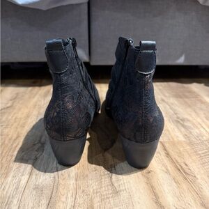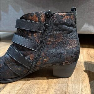 Elegant ankle boots with floral pattern. Features decorative straps. Perfect for any occasion.