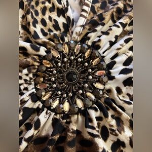 Stylish leopard print top with a jeweled front detail. Features chic cut-out shoulders.