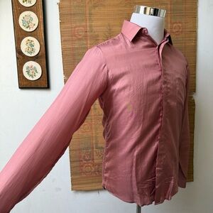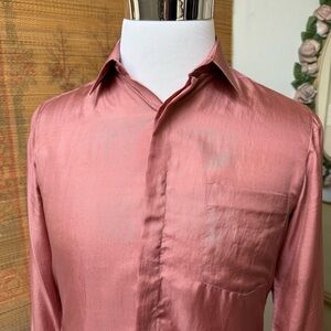 What’s cool? Dusty rose pink, luxurious breezy silk, hidden button enclosure, chest pocket, button cuff sleeves