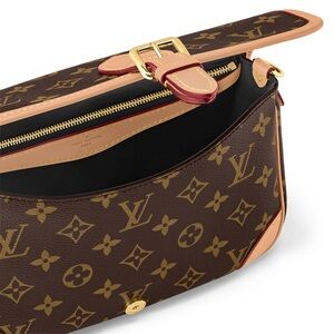 The Diane satchel in Monogram canvas revisits a classic model from the 90s, combining such vintage details as leather corners and an archival-inspired buckle with the modern functionality of smart pockets and a well-organized interior. The exclusive wide jacquard strap reverses from a bold Louis Vuitton signature to a subtle Monogram Flower motif.