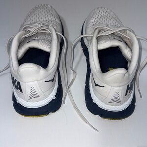 Hoka men's shoes in white with yellow accents. Designed for athletic performance.