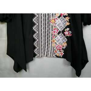 This April Sky blouse/top in size 1X features a boho chic style with a black floral embroidered design, perfect for casual occasions.