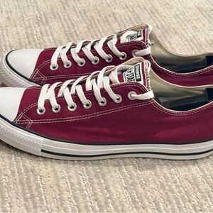 Classic Chuck Taylor Converse All-Star sneakers in rich burgundy. Features iconic white laces and toe cap. Great for everyday wear.