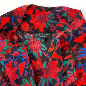 Rag & Bone Emily Tie-Neck Silk Blouse in a red multi floral print. It features a vibrant floral pattern against a black background and includes a self-tie neck scarf detail.