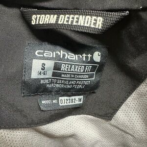 Durable black utility jacket by Carhartt. Features a practical hood and sleek design. Ideal for versatile wear.