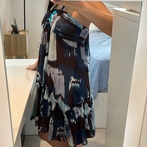 Strapless with neck tie. Worn one time. the gems are a little loose.