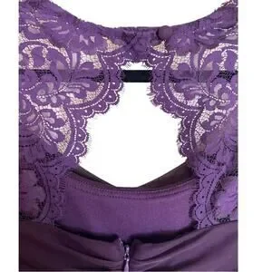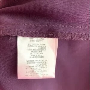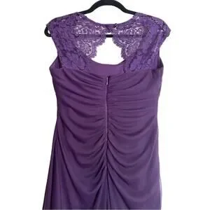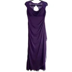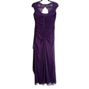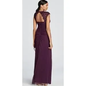 Excellent condition. Gorgeous eggplant purple color. Stunning illusion gown. Full length. A-line silhouette. Cap sleeves. Lined. Ruched gathered along side. Back zip. Scoop neckline. Padding at chest.