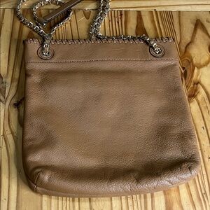 NWOT Beautiful Tory Burch Marion Tan Pebbled Leather Bag Fabric lined. Multiple inner pockets. Gold hardware. Smooth, soft leather. 11.5" x 12" x 2.5" strap drop long 23.5" strap drop short 12.5" Elegant brown leather bag with chain straps, perfect for any occasion.