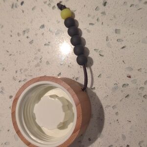 Stylish glass water bottle with a gray silicone sleeve and wooden lid. Features a decorative bead accent.