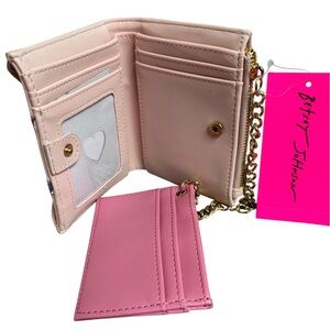 Betsey Johnson adorable embroidered Gummy Bear bifold wallet has gold tone hardware & logo on front, snap closure, ID window, 3 card slots, bill compartment, attached card holder with 4 card slots and middle compartment, zip coin compartment