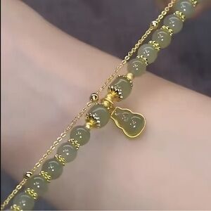 This elegant bracelet features beautiful green beads complemented by a gold chain. Perfect for adding a touch of sophistication to any outfit.