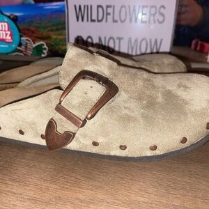 Madden Girl suede Birkenstock style shoes with big chunky buckle and rivets. Worn maybe twice. I think they’re size 9 but the fit a tad snug on me so I put 8.5.