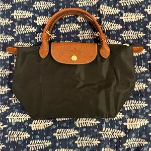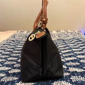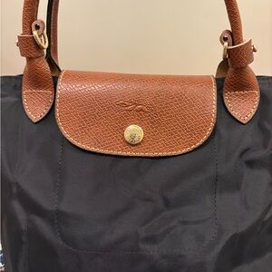 12” across and 8” from top to bottom. Lightly used and in excellent shape. Elegant Longchamp tote with black body and brown leather accents. Ideal for daily use.