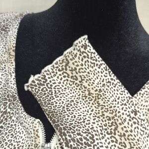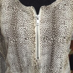 Elevate your wardrobe with this stunning Chaser leopard print blouse. Featuring a sophisticated tan and gray animal print, this top combines a grunge-chic aesthetic with a comfortable, soft-touch fabric. The silver quarter-zip front allows for a customizable neckline, while the lettuce-edge hem adds a subtle Y2K touch. New with tags!
