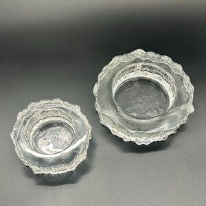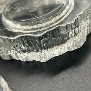 This vintage set of 2 Iittala “Aslak” clear glass dishes / candle holders was designed by renowned Finnish designer Tapio Wirkkala as part of the Aslak range (1972). Known for its distinctive ice-like / bark-textured surface, this design reflects Wirkkala’s deep connection to Nordic nature and modernist form.
