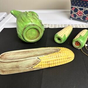 Vintage Set of Corn in Husk Pottery of Jug Platter Salt & Pepper Shakers Rare
