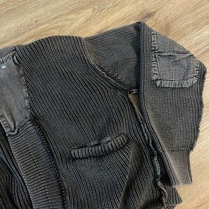 Chic dark gray cardigan with textured knit. Perfect for layering.