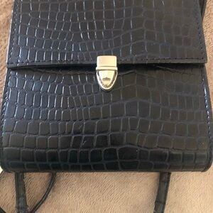 Stylish black croc-embossed crossbody bag with a sleek design. Perfect for any occasion.