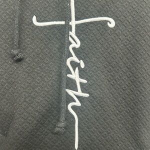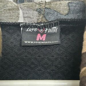 Camouflage hoodie with bold 'Faith' label. Comfortable and stylish.