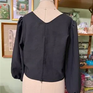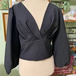 Chic black blouse with deep V-neck. Long, elegant sleeves. Perfect for stylish occasions.