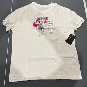 Nike woman’s tee with vibrant pink and purple logo. Features playful design. Ideal for casual wear.nwt