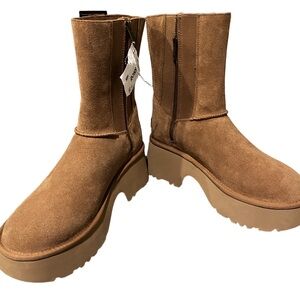 Authentic UGG Classic Short Platform boots in Chestnut. Features the iconic suede upper with cozy sheepskin lining and a chunky platform sole for extra height and comfort. Classic mid-calf silhouette with durable traction outsole. Warm, stylish, and perfect for fall and winter wear.
