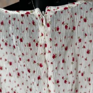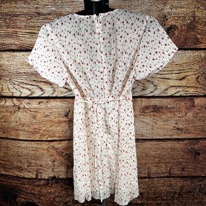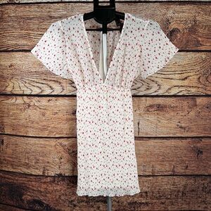 Stylish mini dress with a V-neckline. Features a white base with red floral print. Perfect for casual outings.