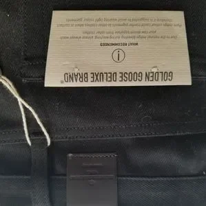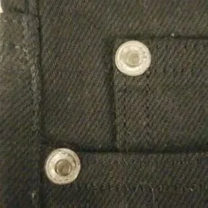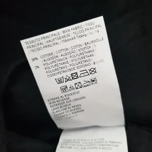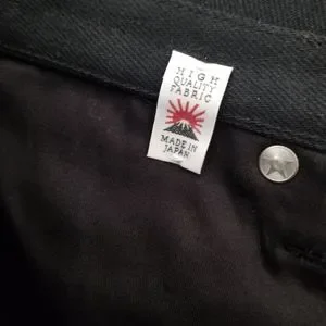 Features: black, asymmetric waistband, straight leg, skinny, 98% cotton 2% polyurethane, fabric made in Japan