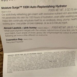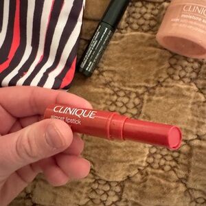 Clinique lipstick in Pink Honey. Also includes mascara and moisturizer. Please see photos for sizes and product information. Comes with a stylish striped pouch. All products are new, never used.