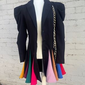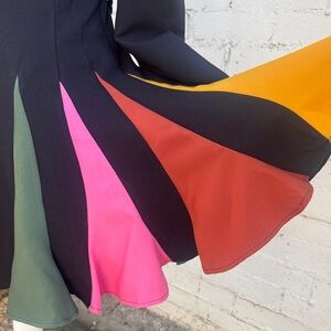 Whimsical black coat dress with ruched and puffy sleeves, 2 gold chains across the front, and colorful panels in the pleated peplum skirt—each of the 14 panels is a different color!