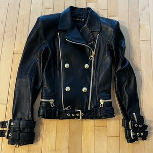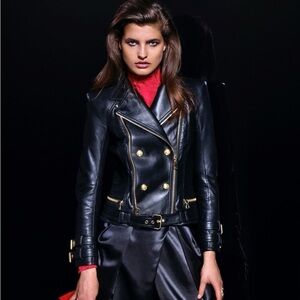 Sophisticated black leather jacket with gold accents. Features double-breasted design and bold buttons. Ideal for a stylish statement.
