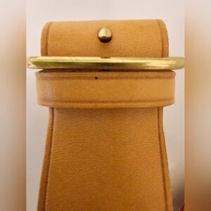 Stylish tan leather bag featuring elegant gold accents. Perfect for any occasion.
