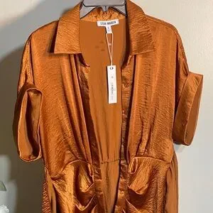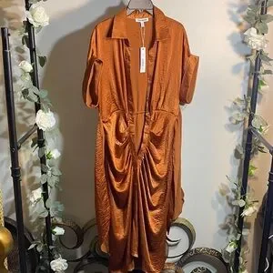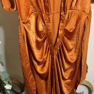 Elegant copper midi dress with draped front. Ideal for any occasion.