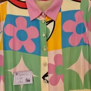 100% soft woven viscose with pockets, enamel buttons, elastic waist, and bishop sleeves. Absolutely gorgeous dress.